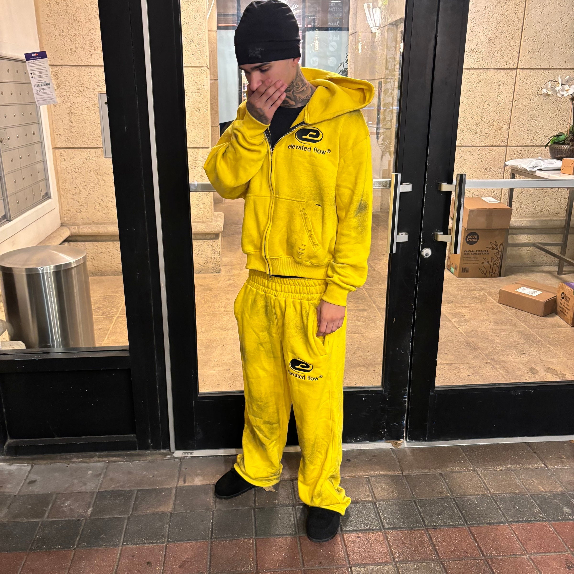 - Turn the hoodie and sweatpants inside out before washing to protect the fabric and printed logo.